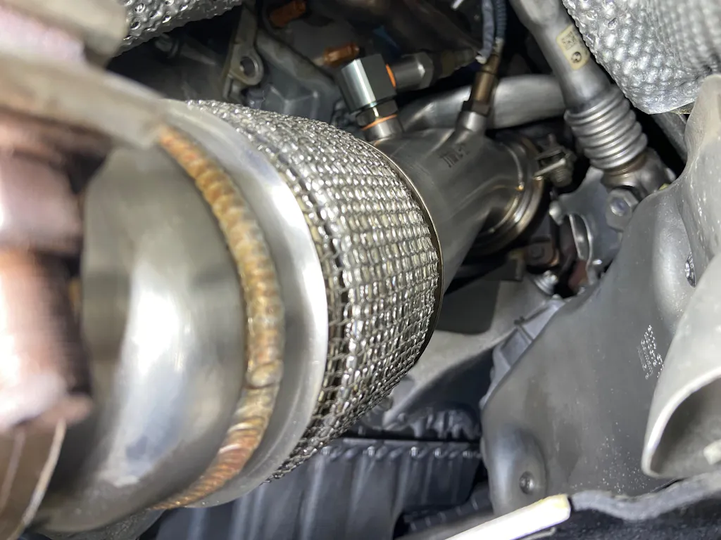 当ダウンパイプ交換車で20-30馬力向上したという情報も確認しております。また排気効率を高める事でタービンレスポンスアップにも効果があります。
